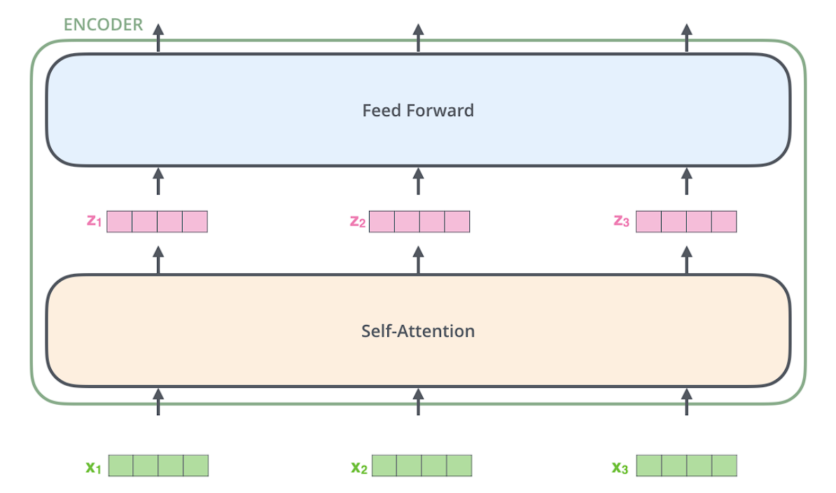 An encoder receives a list of vectors as input. It processes this list by passing these vectors into a ‘self-attention’ layer, then into a feed-forward neural network, then sends out the output upwards to the next encoder.