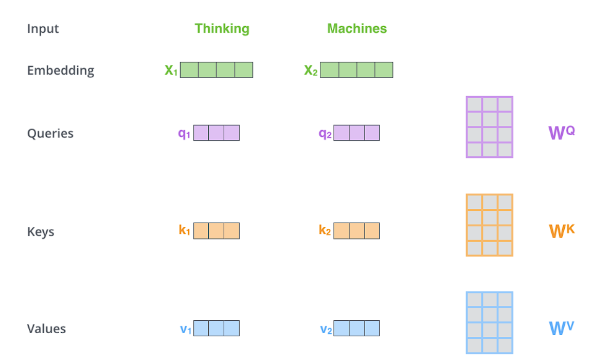 Step 1 : For each word, we create a Query vector, a Key vector, and a Value vector. These vectors are created by multiplying the embedding by three matrices (Wq, Wk, Wv) that we trained during the training process.
