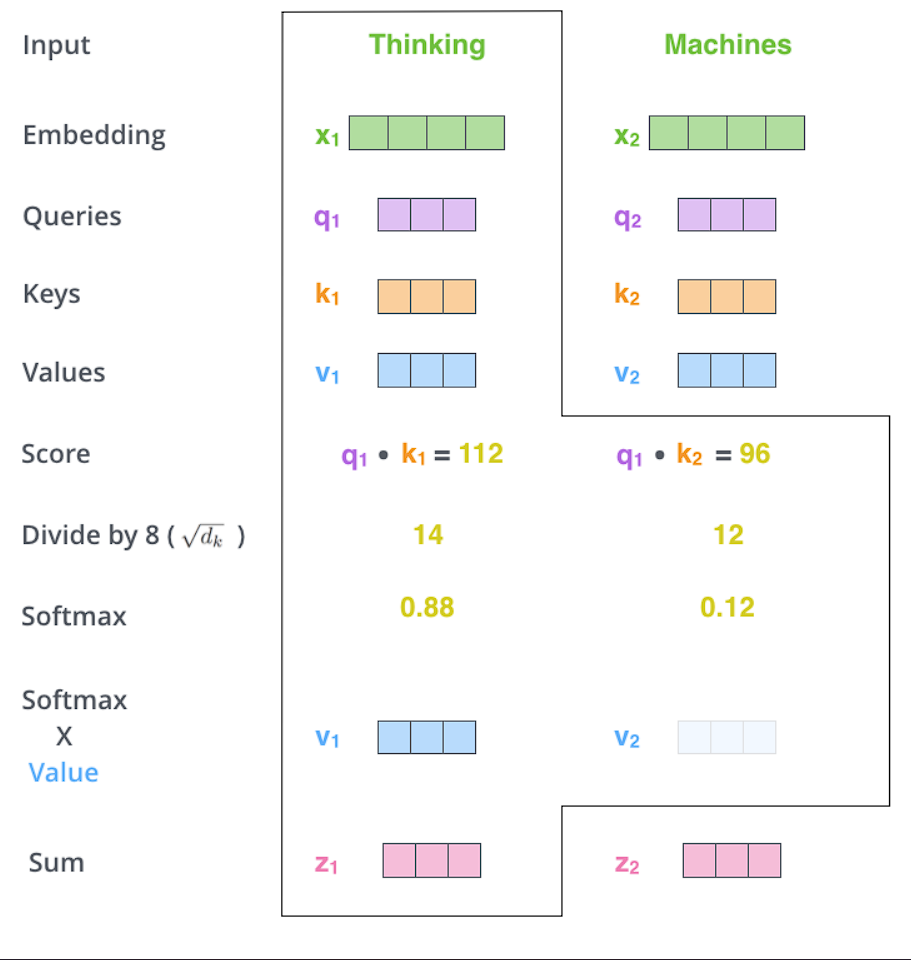 Step 5 : Multiply each value vector by the softmax score. The intuition here is to keep intact the values of the word(s) we want to focus on, and drown-out irrelevant words (by multiplying them by tiny numbers like 0.001).
